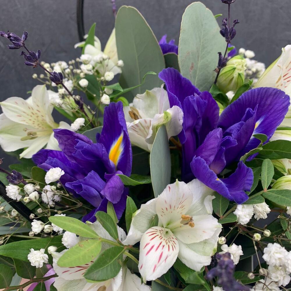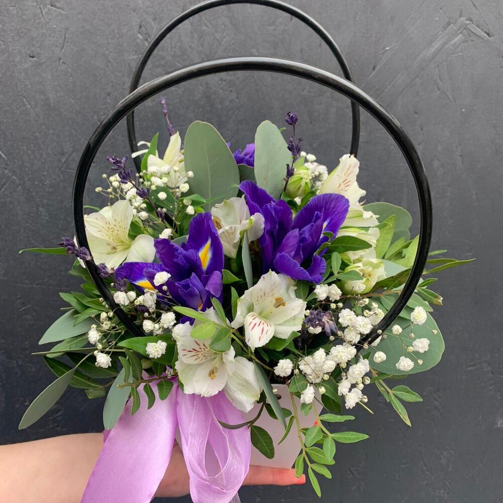 Ирисы с альстромериями, гипсофилой и лавандой с зеленью в сумочке в Аргуне